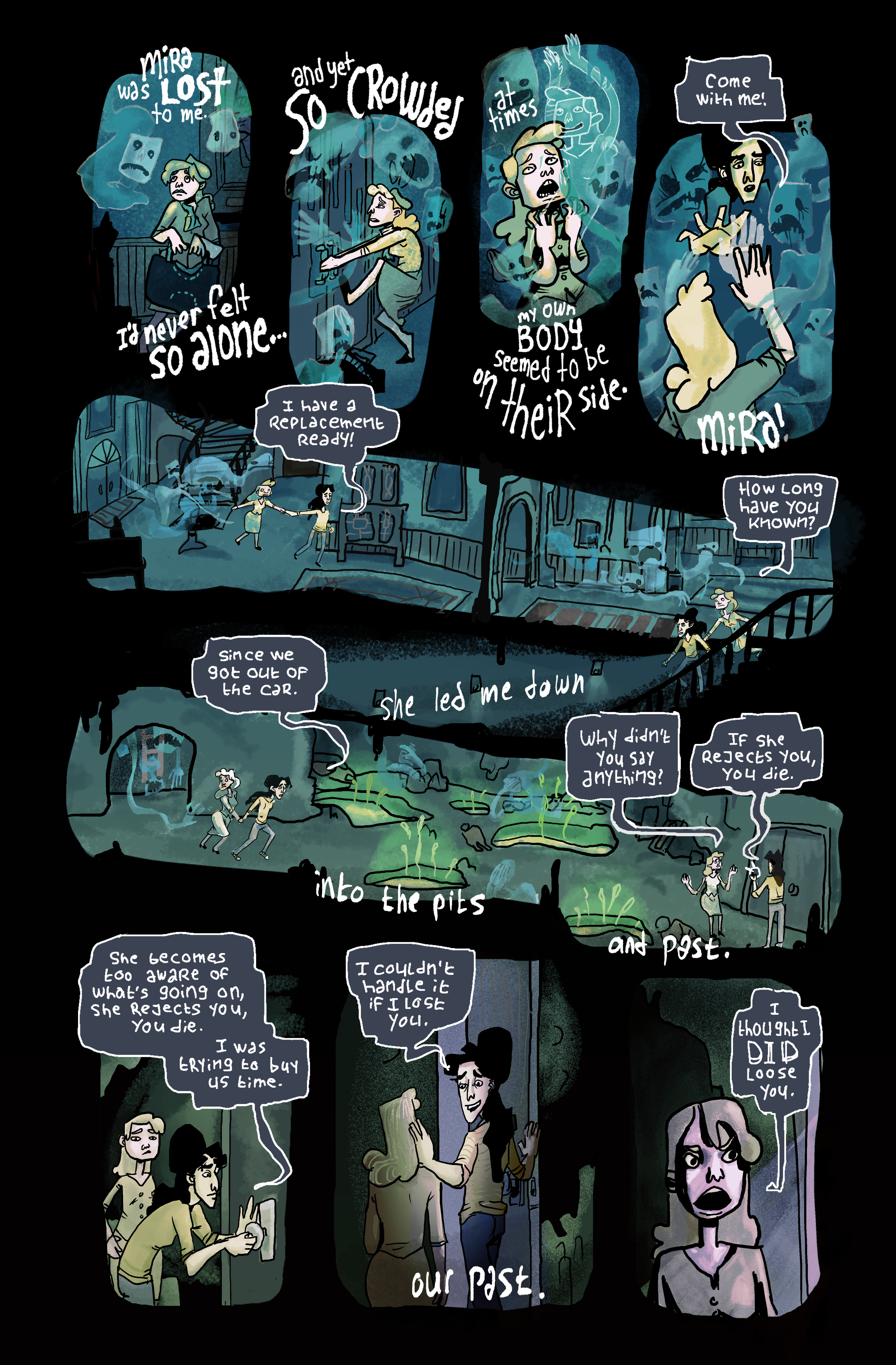 My story is about two married ladies whose trust in each other is complicated by the haunted house they inherit. Maybe. I experimented a lot with hand-drawn typography, and the story is very much inspired by Gothic Romance comics and short stories, with an extra twist.